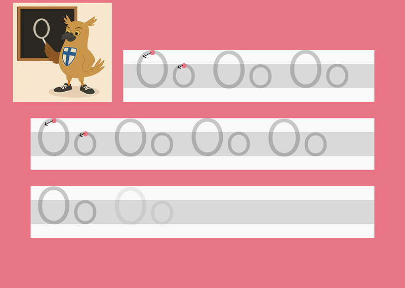 O-kirjain. Vahvista kirjaimet viivaa pitkin. Opetellaan kirjoittamaan O -kirjaimia.