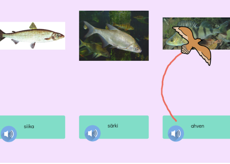 Tunnista eläimiä. Tässä tehtävässä tunnistetaan Suomen kaloja ja matelijoita. Yhdistä oikein.